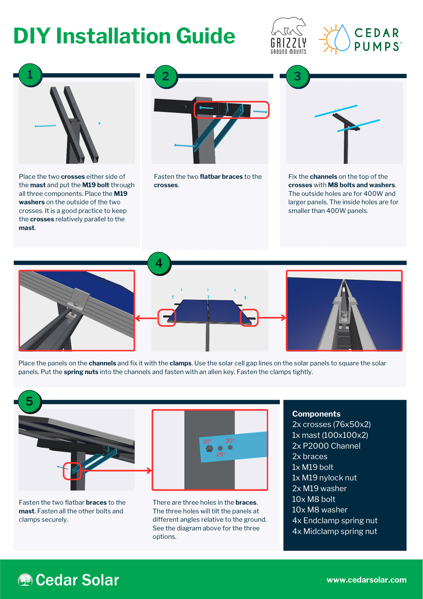 Universal Groundmount Frame 2 x 90w - 560w solar panels can fit on the frame. Includes Pole & Frame. Any panel brand. All components come in the mounting pole for easy transport.